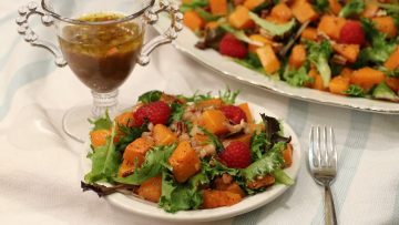 This healthy keto version of a Roasted Butternut Squash Salad with mixed greens, topped with pecans, fresh raspberries and a perfect apple cider and Balsamic vinaigrette can be served as a side dish or as a light meal.