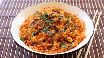 This Simple Kimchi Fried Cauliflower Rice has been adapted as a keto recipe and it is made with cauliflower rice, my sugar free Keto Gochujang BBQ Sauce, and kimchi. The basic keto recipe is versatile, and can be made into a full breakfast or other variations.