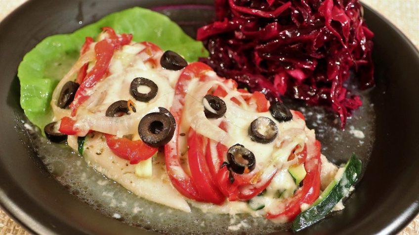 5. Arrange the julienned zucchini and julienned red bell pepper/capsicum, a fourth of the onion rings, and olives on top of each sole fillet