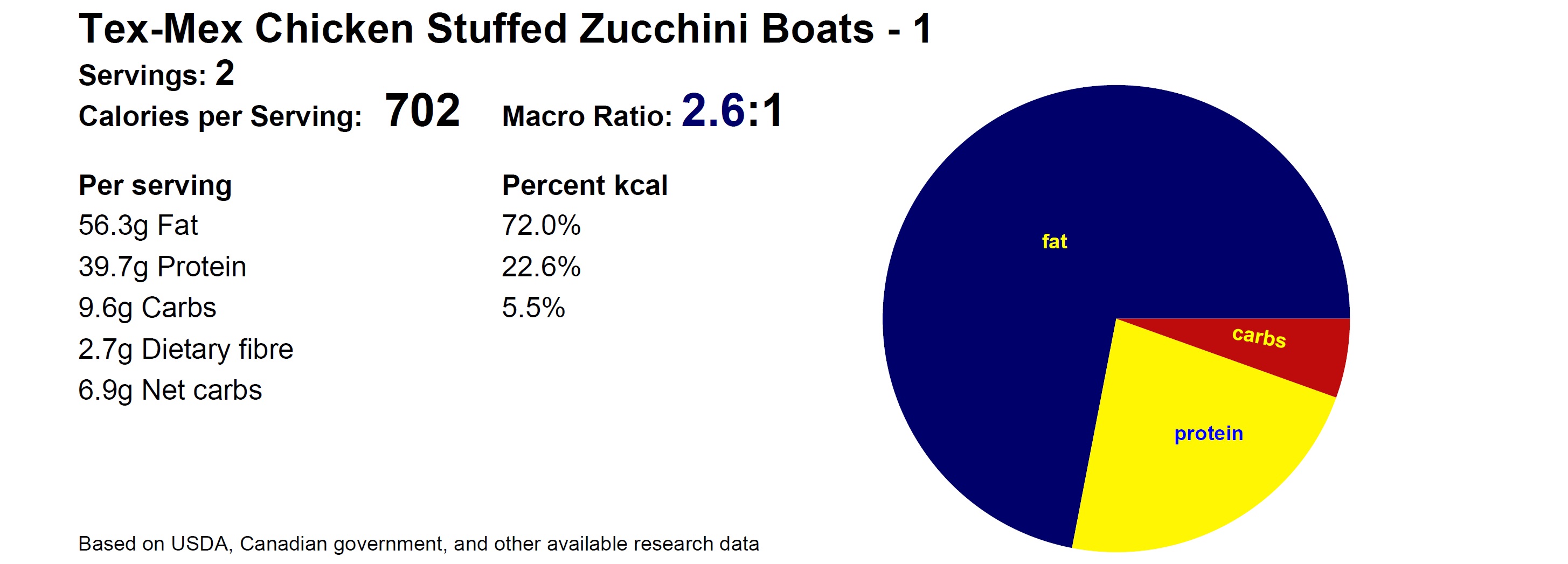16. Lastly, distribute 8 quarters (pieces from 2 cherry/grape tomatoes) over the length of the Tex-Mex Chicken Stuffed Zucchini Boat. Enjoy!